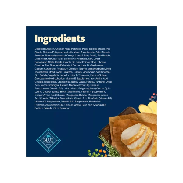 BLUE Freedom Grain-Free Adult Dry Dog Food is made with chicken as the first ingredient, plus antioxidant-rich fruits and vegetables for truly balanced nutrition. This wellness dog food is free from grains that contain gluten, which some Pet Parents choose to avoid. It’s also formulated with an optimal balance of Omega 3 & 6 fatty acids to promote a shiny coat and healthy skin. And like all Blue Buffalo dog food recipes, this dog food contains no chicken (or poultry) by-product meals. It’s also free from corn, wheat, and soy.