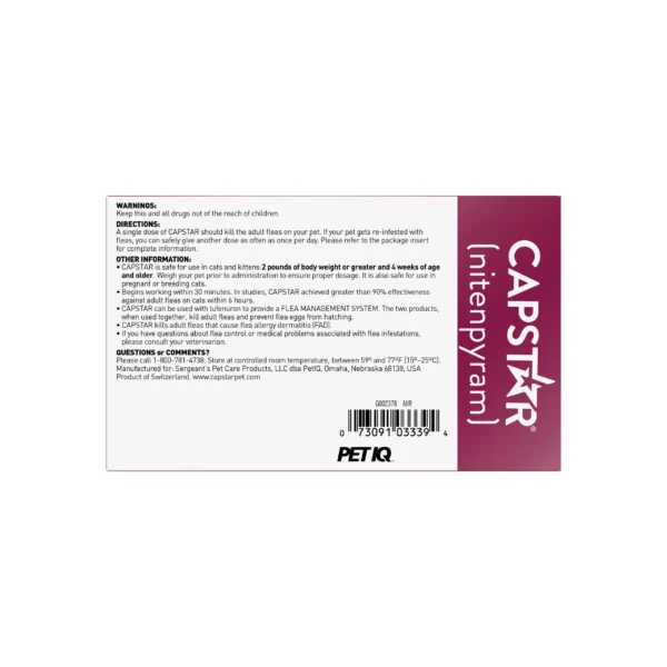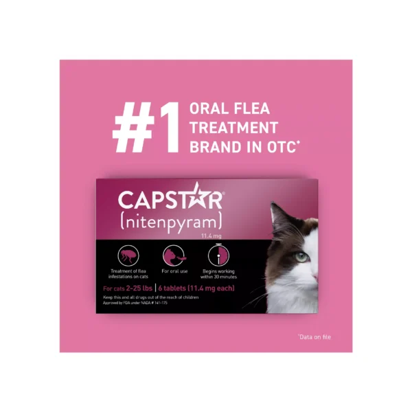 CAPSTAR (nitenpyram) is a fast-acting cat flea treatment tablet for use with cats that starts killing fleas in only 30 minutes. A single dose of CAPSTAR oral flea treatment kills 90% of adult fleas within 6 hours for cats. Give this oral flea treatment and watch the dead fleas fall off your pet. CAPSTAR flea tablets are available for cats and kittens 2-25 pounds, and 4 weeks of age or older.