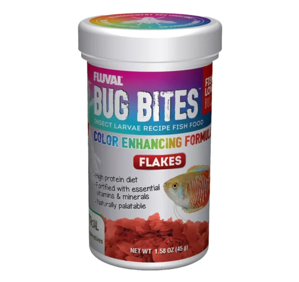 Fluval Bug Bites Color Enhancing Flakes are specifically formulated to address the natural, insect-based feeding habits of fish, with added vitamins, minerals and other trace nutrients important to their health and vitality. Suitable as a complement to all Bug Bites formulas or as a daily diet on its own,