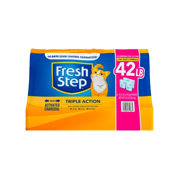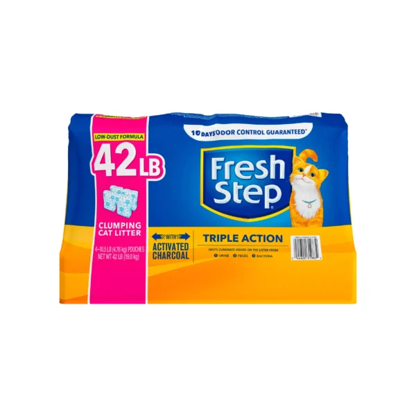 Fresh Step Triple Action Clumping Cat Litter fights odors from urine, feces and bacteria with Activated Charcoal Technology and Ammonia Block Technology. Made with larger, premium clay particles, this clumping cat litter stays inside the box to help keep your catĆ¢ĀĀs paws and your floors clean. This clay litter is 99.9% dust free and forms tight clumps, which prevent stinky crumbles from being left behind after scooping and makes cleanup fast and easy. The four compact, convenient, resealable packs make litter easy to carry, pour and store; four compact 10.5 lb bags equal one 42 lb bag of litter.