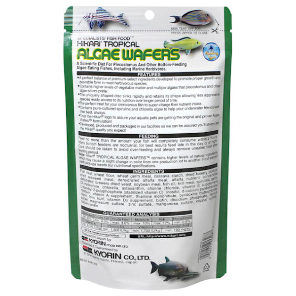 Complete daily diet, fortified with vitamin supplements, for the hard to feed plecostomus, algae eaters and other bottom feeders. Formulated with mostly vegetable materials. Sinking wafers will not cloud the water.