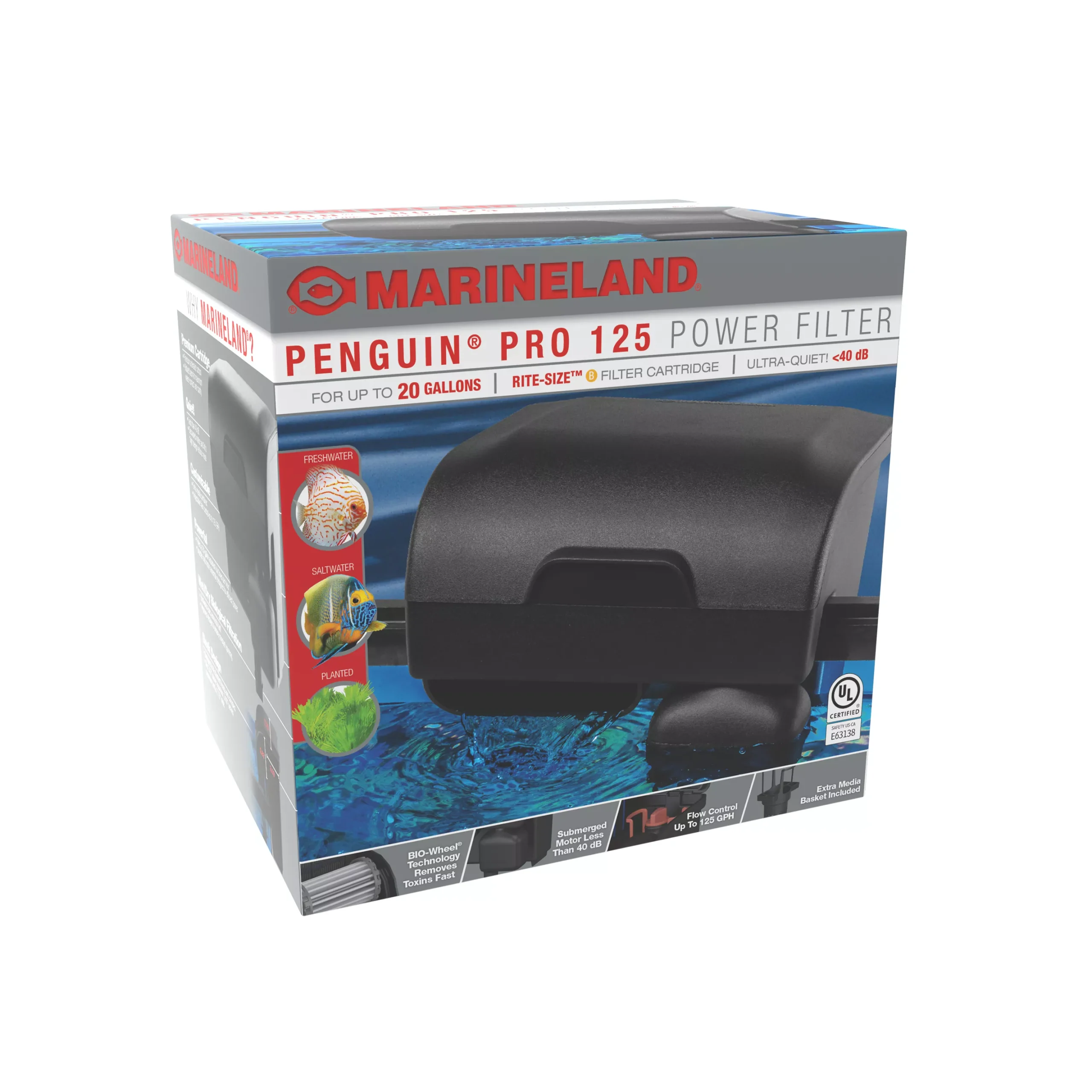 The Marineland Penguin PRO 125 Power Filter delivers easy, three-stage mechanical, chemical and biological aquarium filtration. This ultra-quiet filter has a decoupled motor to reduce noise so you can relax and enjoy your aquarium. This power filter contains BIO-Wheel technology to provide wet/dry biological filtration for nitrifying bacteria growth and eliminating toxic ammonia and nitrate fast. Uses Marineland Rite-Size B Filter Cartridge. Filters your 20-gallon aquarium six times per hour with flow control up to 125 GPH. Available in six sizes: 100 (for up to 10 gallons), 125 (for up to 20 gallons), 175 (for up to 30 gallons), 275 (for up to 50 gallons), 375 (for up to 75 gallons), 450 (for up to 90 gallons).