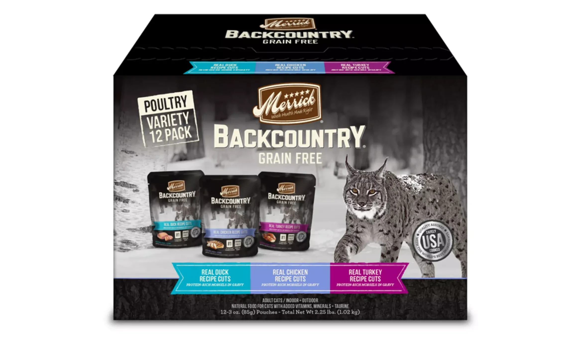 - This cat food variety pack contains three varieties of Merrick Backcountry Cuts in Gravy recipes: Real Duck Recipe, Real Chicken Recipe and Real Turkey Recipe