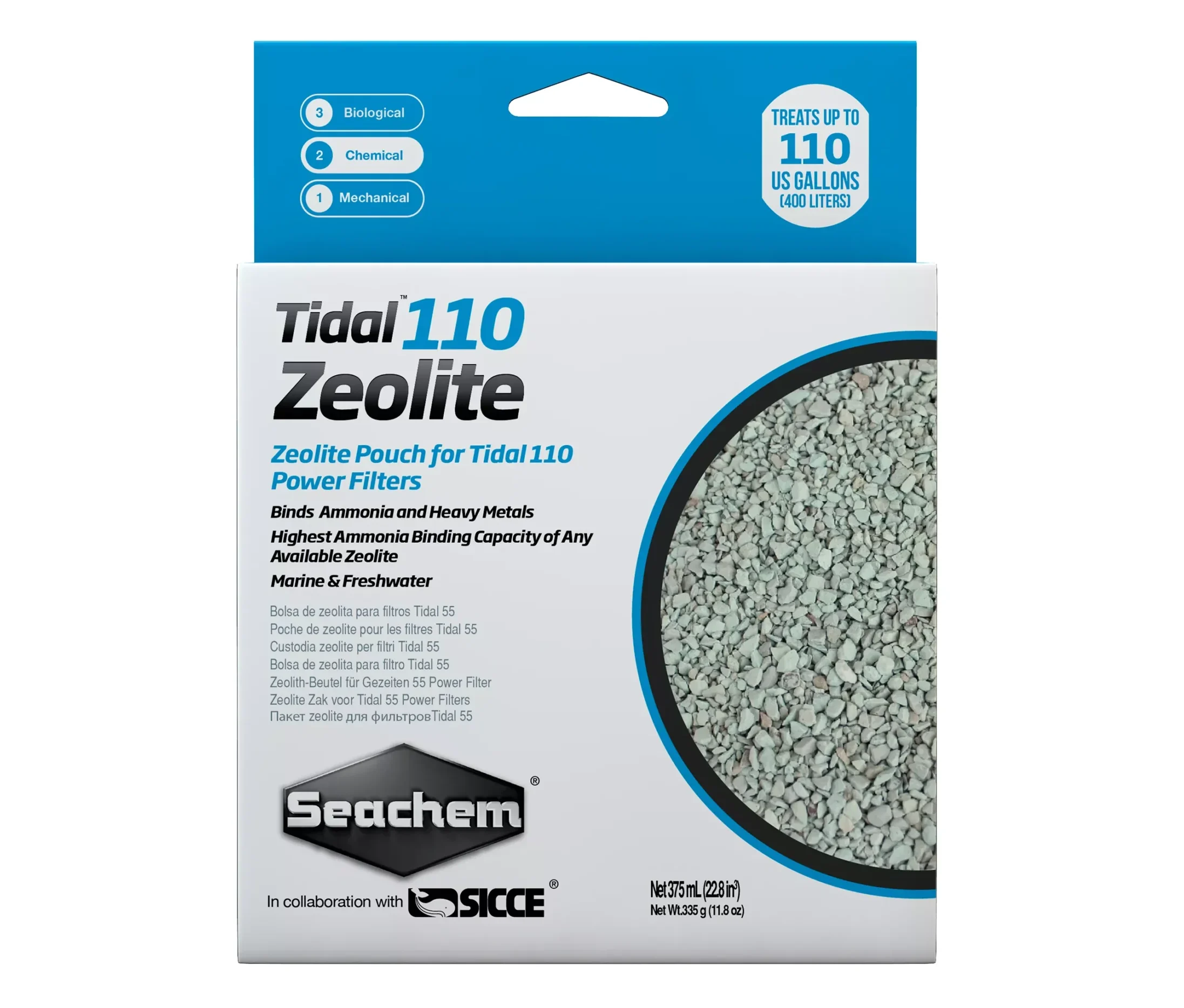 Seachem Tidal 0 Zeolite Aquarium Filters For more than 30 years, aquarium hobbyists have turned to Seachem Laboratories for products designed by chemists and biologists. Seachem Tidal 110 Power Filter is designed for a 110-gallon tank. It has features like a self-priming pump, dual water intake with surface skimmer, adjustable flow, maintenance monitor, self-cleaning impeller and a filter basket that holds any kind of filtration media.