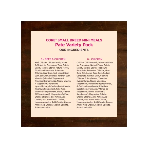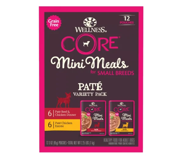 Mighty tasty, mighty nutritious mini meals packed with protein just for your small dog are now available in this Wellness CORE Mini Meals Pate Variety Pack. These mini meals are packed with protein just for your small dog, and also make a great snack or travel snack size for any adult dog.